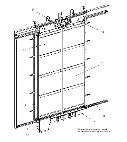 廳門由門滑輪懸掛在廳門導軌上,下部通過門滑塊與廳門地坎配合。