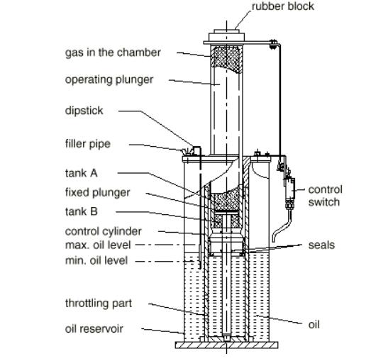 由于液壓式緩沖器是將電梯撞擊動能轉(zhuǎn)化為液壓油的熱能散發(fā)掉,因此無回彈作用,又稱為耗能型緩沖器。