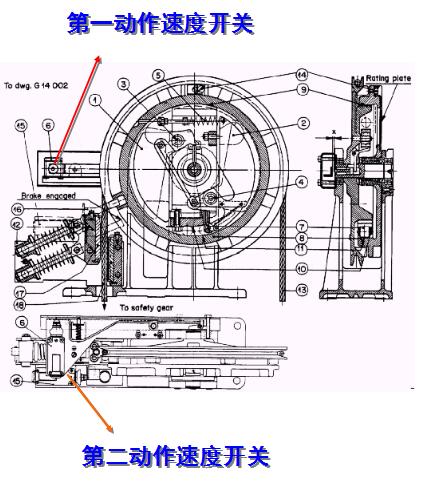 超速開關(guān)(第一動作速度)首先動作,切斷電梯安全回路或控制回路使電磁制動器失電制動,如電梯繼續(xù)向下加速運行,則限速器進而卡住鋼絲繩,提起安全鉗聯(lián)動拉杠,迫使安全鉗動作,將電梯強行制停在導(dǎo)軌上。