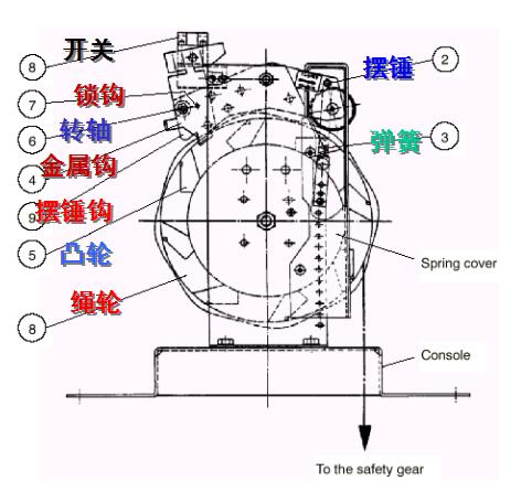 組成:繩鉗彈簧、夾繩鉗、壓縮彈簧、連接板、拋塊、心軸、繩輪、棘齒罩、機架及偏心叉等
