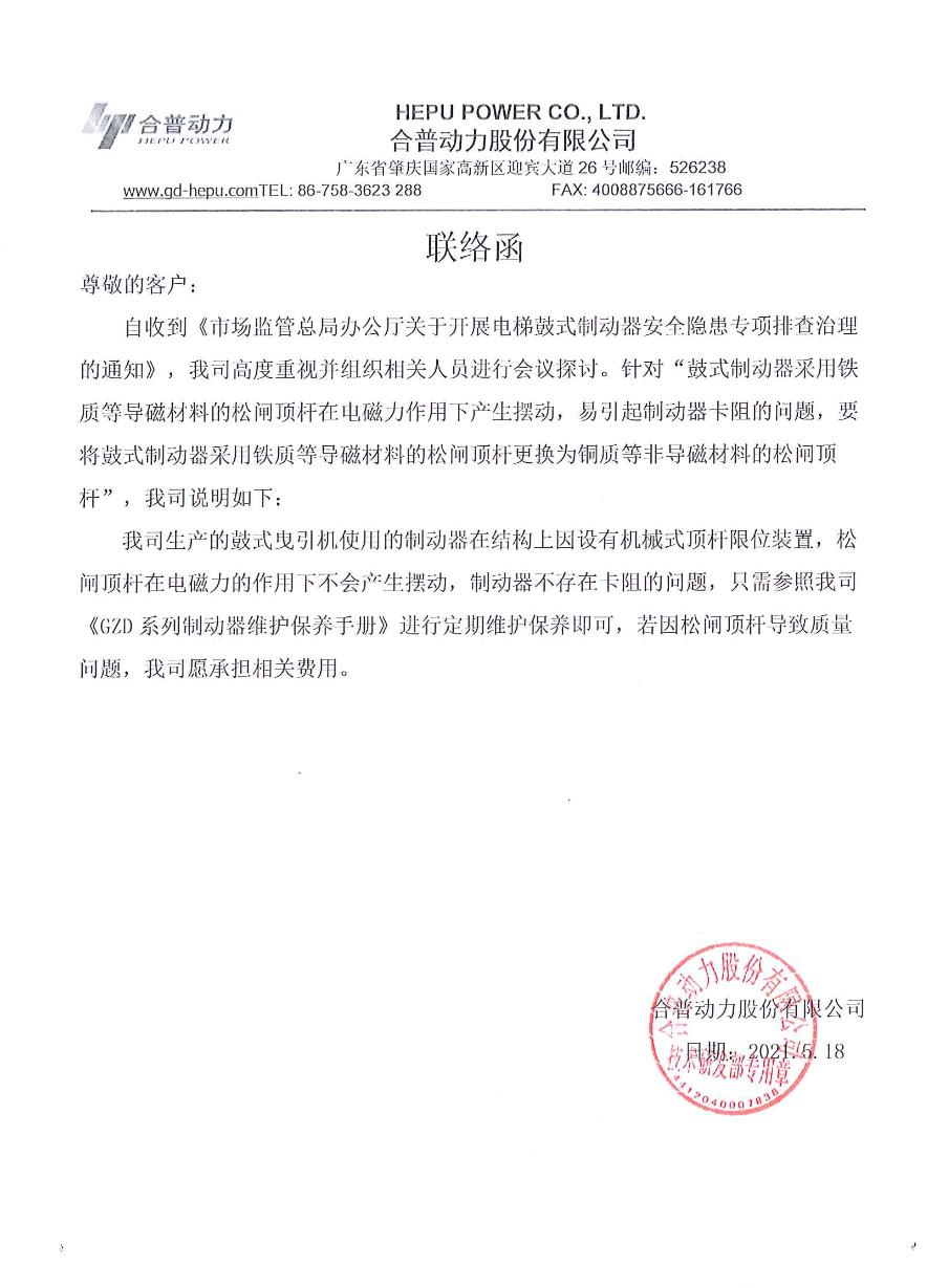 遠(yuǎn)大電梯供應(yīng)商合普關(guān)于鼓式制動(dòng)器頂桿的說明函