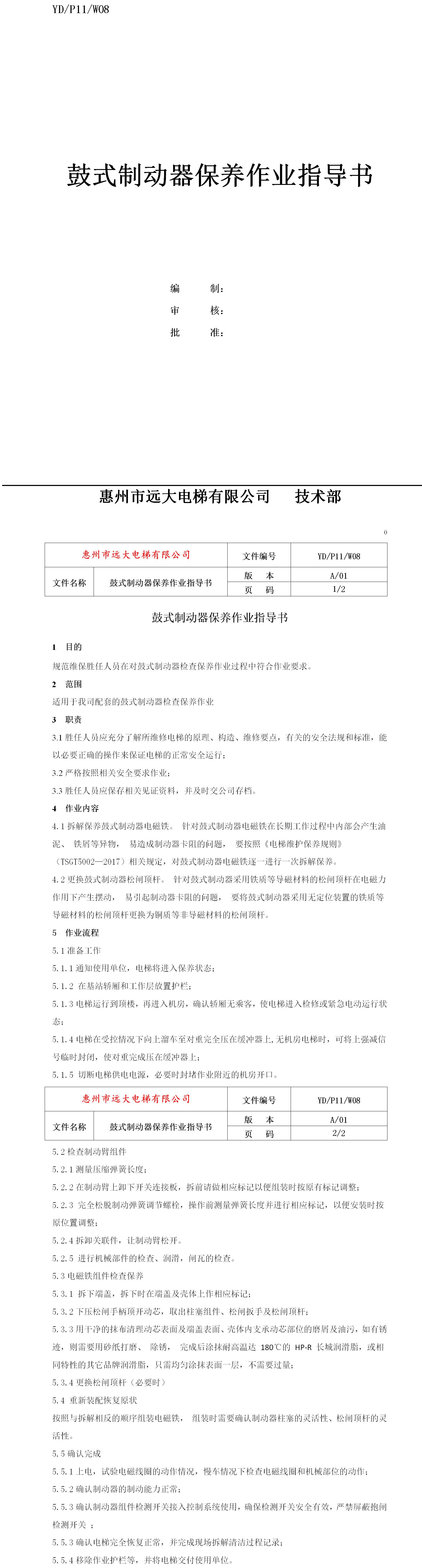 遠(yuǎn)大電梯鼓式制動(dòng)器保養(yǎng)作業(yè)指導(dǎo)書